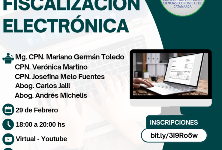 Estimados ColegasInvitamos a ustedes a participar del curso «FISCALIZACIÓN ELECTRONICA» a cargo de Mg. CPN. Mariano Germán Toledo; CPN. Verónica Martino; CPN. Josefina Melo Fuentes; Abog. Carlos Jalil, Abog. Andrés Michelis. Día y Hora: Jueves 29 de Febrero, de 18 a 20hsDURACIÓN TOTAL DOS HORAS ...