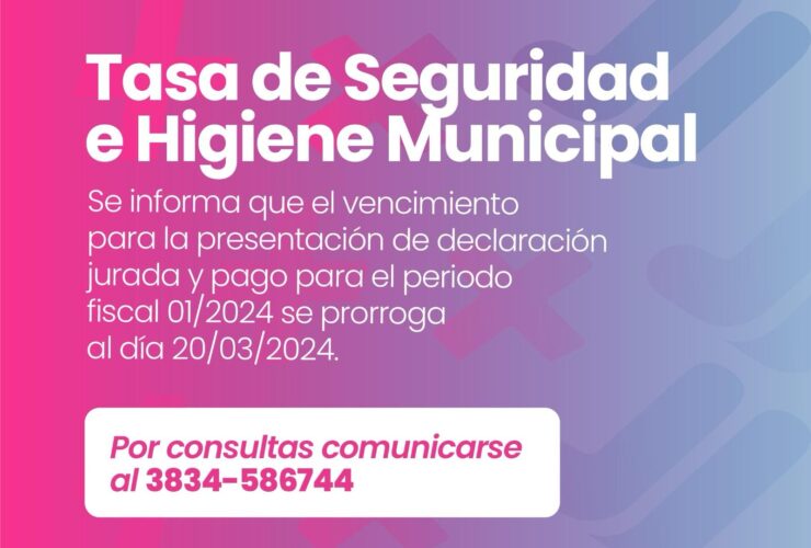 Estimados colegas: Informamos a ustedes que el vencimiento para la presentación de declaración jurada y pago de la tasa de seguridad e higiene (FME) para el periodo fiscal 01/2024, se prorroga al día 20/03/2024. Por consultas comunicarse al 3834586744 (Rentas Municipal de Fray Mamerto Esquiú) ...