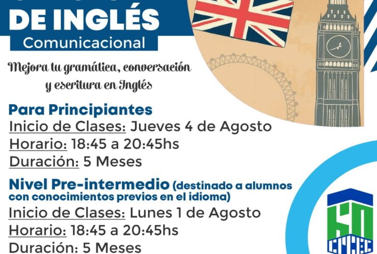 Estimados Colegas: Les contamos que hoy Lunes 08/08 iniciaremos una nueva capacitación del curso de inglés comunicacional. Este ciclo será exclusivamente virtual, por plataforma ZoomLas clases se dictarán todos los Lunes, en el horario de 19 a 21 hs. Tienen una duración de 5 meses. ...