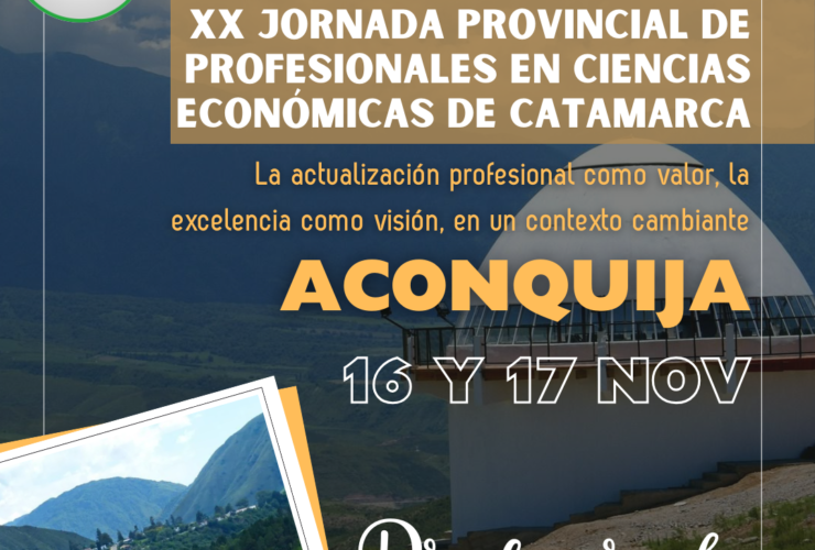 Estimados Colegas!El Sábado 16/11 organizaremos nuestra XX Jornada Provincial de Profesionales en Ciencias Económicas, en la localidad de Aconquija, donde presenciaremos charlas sobre importantes temas de actualidad y confraternizaremos con nuestros colegas del interior provincial.El evento académico es en el HOTEL GRAN PUCARA. INSCRIBIRSE AQUÍ ...