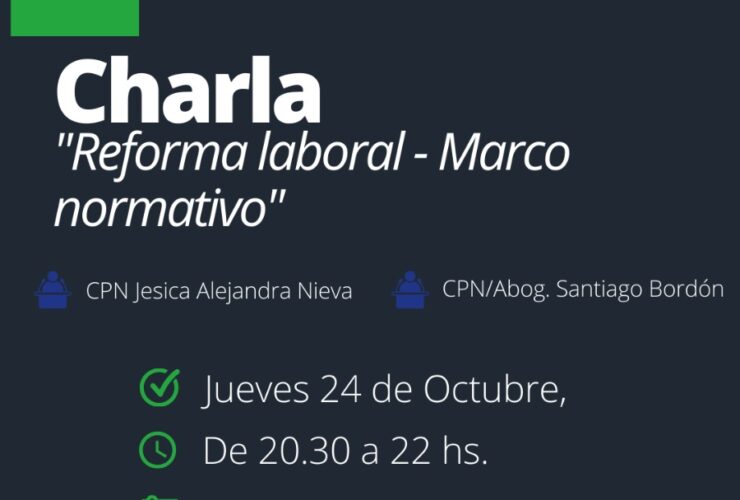 Estimados ColegasInvitamos a ustedes a la Charla «Reforma laboral – Marco normativo», a cargo de integrantes de nuestra Comisión Laboral (CPN Jesica Alejandra Nieva y CPN/Abog. Santiago Bordón)Día y Hora: Jueves 24 de Octubre, de 20.30 a 22 hs. 💲Valor de inscripción:Gratis todo el público ...