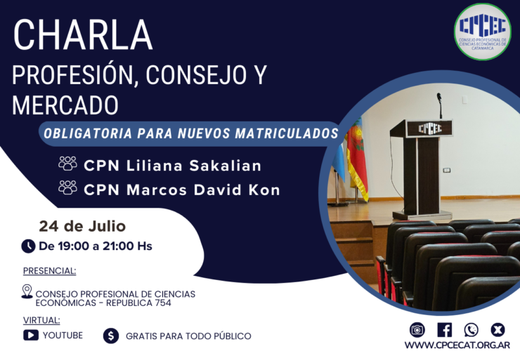 Estimados Colegas Recordamos a ustedes que hoy 24/07, de 19 a 21 hs., se llevará la Charla denominada «Profesión, Consejo y Mercado», a cargo de la CPN Liliana Sakalian (Miembro Comisión de Ética del CPCE) y CPN Marcos David Kon (Secretario Técnico del CPCE).La misma será ...
