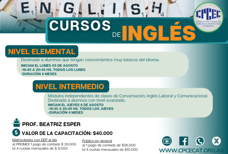 Estimados Colegas: Les contamos que a partir del 05/08 retomaremos las clases de inglés Comunicacional. Tendremos dos niveles de capacitaciones.Destinado a profesionales de Cs. Económicas y público en general 1) Nivel Elemental – Inglés Comunicacional Destinado a alumnos que tengan conocimientos muy básicos del idioma Las clases inician ...