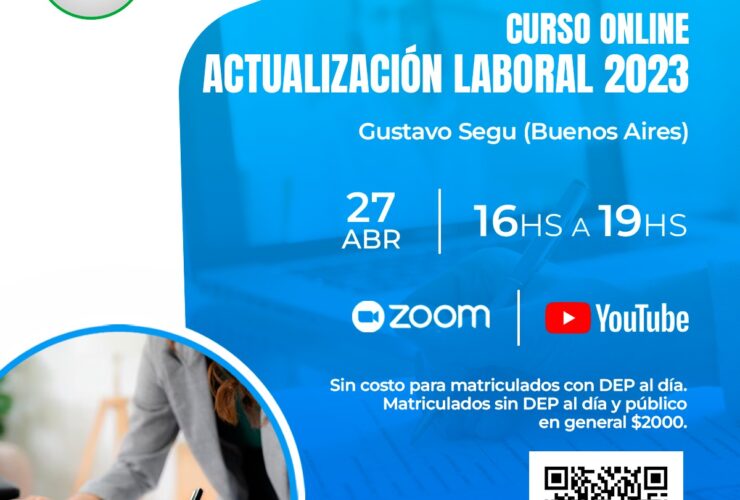 Estimados Colegas Invitamos a ustedes al curso online sobre «Actualización Laboral 2023», a cargo del Abog. Gustavo Segu (Bs. As.) Día y Hora: Jueves 27 de Abril, de 16 a 19 hsDURACIÓN TOTAL TRES HORAS 💲Valor de inscripción:Gratis para matriculados con DEP al díaPara el ...