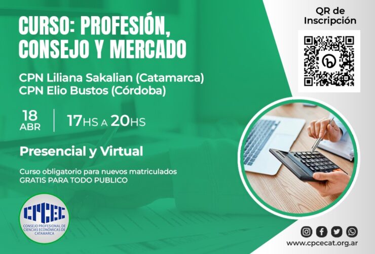 Estimados Colegas Recordamos a uds que hoy martes 18/04, de 17 a 20 hs., se llevará a cabo el curso sobre «Profesión, Consejo y Mercado», a cargo de los CPN Liliana Sakalian (Catamarca) y Elio Bustos (Córdoba).El mismo será de modalidad mixta, virtual y presencial. ...