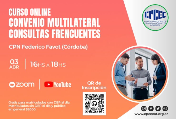 Estimados Colegas Recordamos a ustedes que hoy 03/04, de 16 a 18 hs., se llevará a cabo el curso online sobre «Convenio Multilateral. Consultas frecuentes», a cargo del CPN Federico Favot (Córdoba) 💲Valor de inscripción:Gratis para matriculados con DEP al díaPara el resto: $2000Pagos por ...