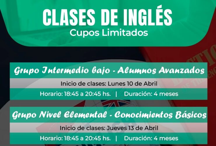 Estimados Colegas: Les contamos que a partir del 10/04 retomaremos las clases de inglés Comunicacional. Tendremos dos niveles de capacitaciones. 1) Inglés intermedio bajo – Alumnos avanzadosImportante: Destinado a alumnos con conocimientos previos en el idiomaLas clases inician el Lunes 10 de abril, de 18:45 ...