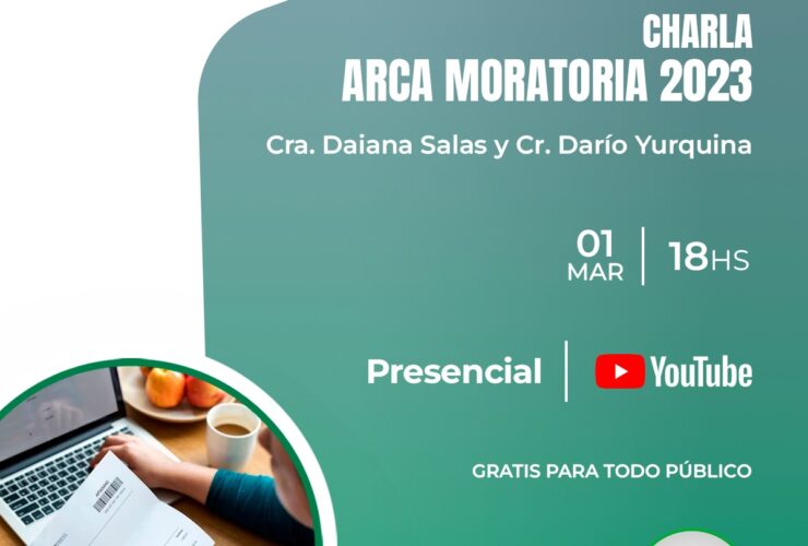 Estimados Colegas Informamos que la charla programada sobre «ARCA Moratoria 2023» se dictará el día 01/03, en el horario de 18 a 19:30 hs, en la sala de capacitación de nuestra sede, a cargo de la Cra Daiana Salas y el Cr Darío Yurquina. La ...