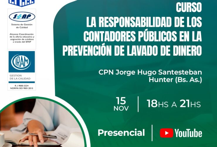 Estimados Colegas Recordamos a ustedes que hoy 15/11, de 18 a 21 hs., se llevará a cabo el curso sobre «La responsabilidad de los Contadores Públicos en la prevención de lavado de dinero», a cargo del CPN Jorge Hugo Santesteban Hunter (Bs. As).El mismo será ...