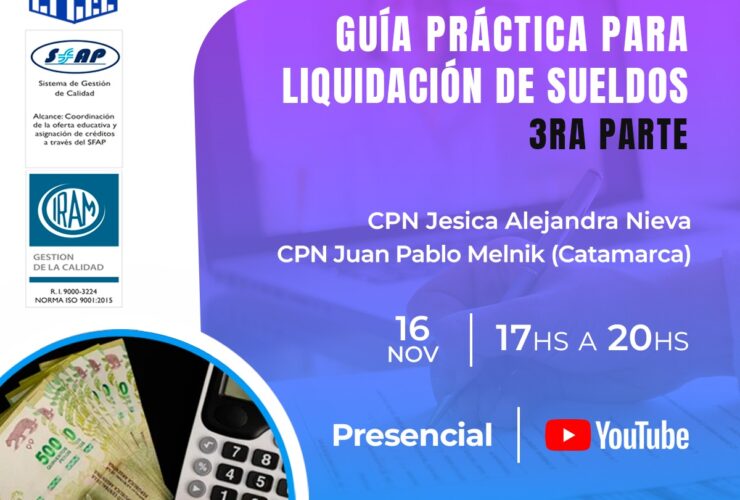 Estimados Colegas Invitamos a ustedes al curso sobre «Guía práctica para liquidación de sueldos – 3ra parte», a cargo de los CPN Jesica A. Nieva y CPN Juan Pablo Melnik (Catamarca).El mismo será de modalidad mixta, virtual y presencial. También se transmitirá en vivo por ...
