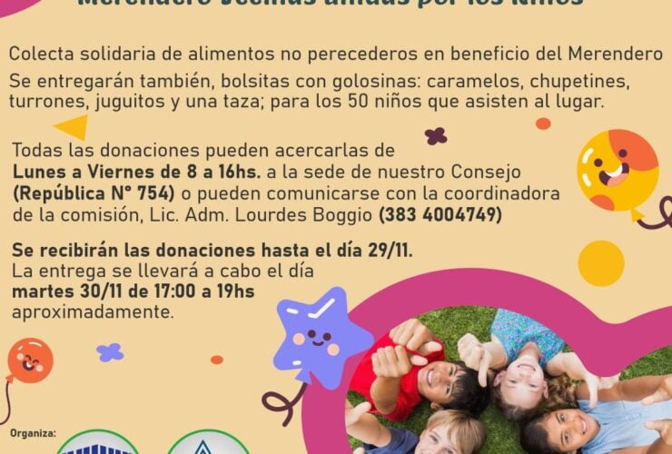 Estimados Colegas Invitamos a uds a sumarse a la colecta solidaria de alimentos no perecederos en beneficio del Merendero «Vecinas unidas por los Niños». Esta colecta está organizada por la Comisión de Administración de nuestro Consejo. Además, se entregarán bolsitas con golosinas: caramelos, chupetines, turrones, juguitos, y una taza; ...