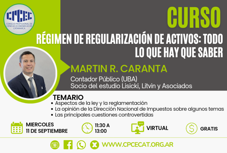 Estimados Colegas Invitamos a ustedes a participar del curso online sobre «Régimen de regularización de activos: todo lo que hay que saber» a cargo del CPN Martín Caranta (Bs As). Día y Hora: Miércoles 11 de Septiembre, de 11:30 a 13 hs Temario:-Aspectos de la ...