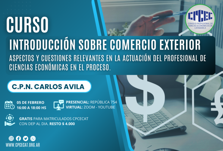 Estimados Colegas Invitamos a ustedes a participar del curso «Introducción sobre Comercio Exterior – Aspectos y cuestiones relevantes en la actuación del Profesional de Ciencias Económicas en el proceso» a cargo del CPN Carlos Ávila Será de modalidad mixta, virtual y presencial. Día y Hora: ...