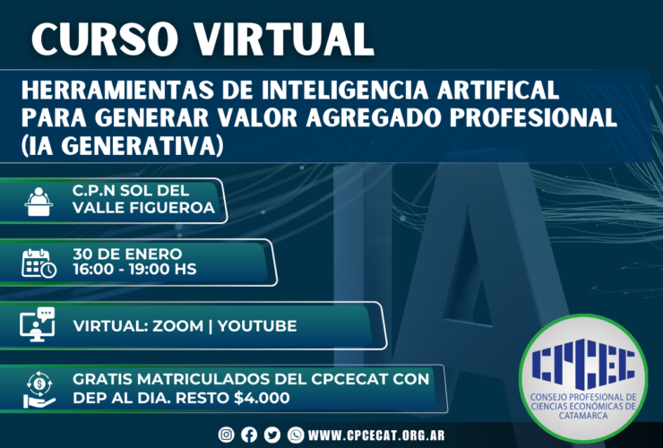 Estimados Colegas Invitamos a uds a participar del curso virtual sobre «Herramientas de Inteligencia Artificial para generar valor agregado profesional (IA Generativa)», a cargo de la CPN Sol del Valle Figueroa (Córdoba)La misma se llevará a cabo el día jueves 30/01 en el horario de ...
