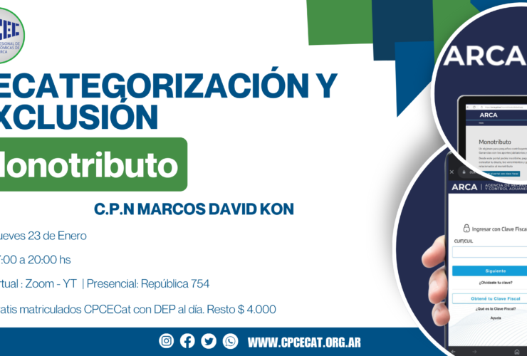 Estimados Colegas Invitamos a ustedes a participar del curso «Recategorización y Exclusión del Monotributo» a cargo del CPN Marcos David Kon Será de modalidad mixta, virtual y presencial. Día y Hora: jueves 23 de enero, de 17 a 20 hsDURACIÓN TOTAL TRES HORAS Inscribirse aquí: https://forms.gle/SvBxgsbJmKs1cE4E7 ...