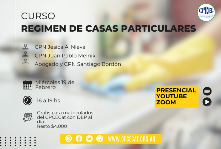 Estimados Colegas Invitamos a ustedes a participar del curso «Régimen de casas particulares» a cargo de la CPN Jesica A. Nieva, CPN Juan Pablo Melnik y Abog. y CPN Santiago BordónSerá de modalidad mixta, virtual y presencial. Día y Hora: Miércoles 19 de Febrero, de 16 ...