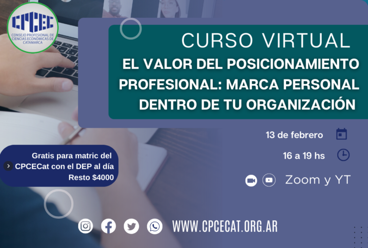 Estimados Colegas Invitamos a uds a participar del curso virtual sobre «El valor del posicionamiento profesional: Marca personal dentro de tu organización», a cargo del Lic. Adm. Jaime Alfaro Aliaga (Jujuy)La misma se llevará a cabo el día jueves 13/02 en el horario de 16 ...