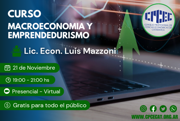Estimados Colegas Recordamos a ustedes que hoy 21/11 se llevará a cabo el curso «Macroeconomía y Emprendedurismo», a cargo del Lic. Econ. Luis Mazzoni, en el horario de 19 a 21 hs. El mismo es destinado a emprendedores y potenciales emprendedores, brindando herramientas para desarrollar ...