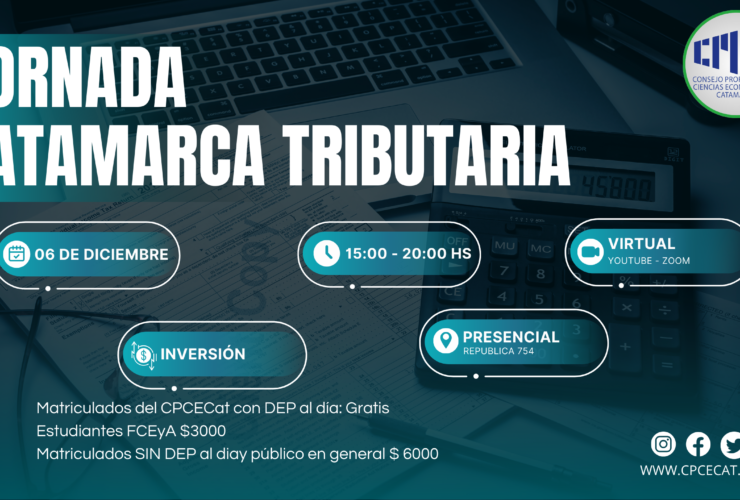 Estimados Colegas! Recordamos a uds que hoy 06/12 se llevará a cabo nuestra «Jornada Catamarca Tributaria», en el Salón Auditorio de nuestra sede, en el horario de 15 a 20 hs. La misma es organizada por la Comisión de Impuestos de nuestro Consejo. 𝐏𝐫𝐨𝐠𝐫𝐚𝐦𝐚:-15 hs ...