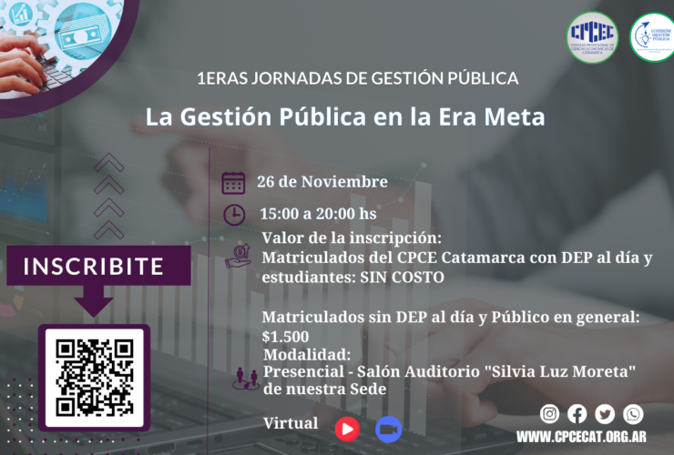 Estimados ColegasInvitamos a uds a participar de la «1ras Jornadas de Gestión Pública», bajo el lema «La Gestión Pública en la Era Meta», la cual se llevará a cabo el día martes 26 de noviembre.Organizada por la Comisión de Licenciados en Gestión Pública de nuestro ...