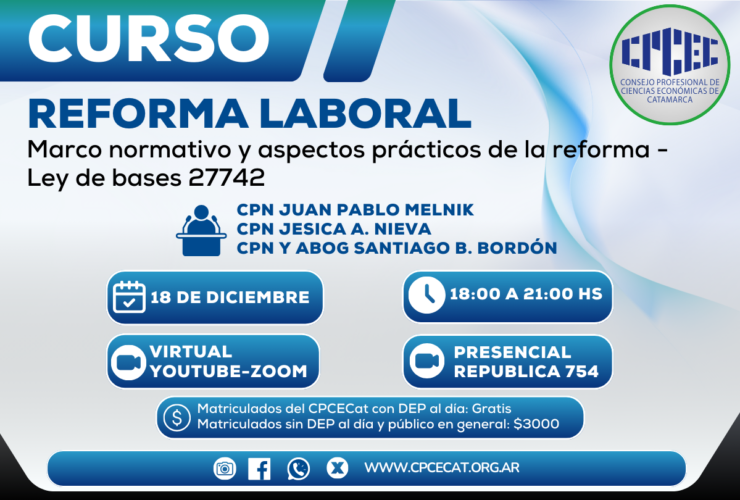Estimados Colegas Invitamos a ustedes a participar del curso «Reforma laboral – Marco normativo y aspectos prácticos de la reforma – Ley de bases 27742» a cargo de la CPN Jesica A. Nieva, CPN Juan Pablo Melnik y CPN y Abog. Santiago B. Bordón Será de modalidad ...