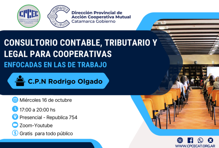 Estimados Colegas Recordamos a ustedes que hoy 16/10, de 17 a 20 hs., se llevará a cabo el «Consultorio Contable, Tributario y Legal para Cooperativas – enfocadas en las de trabajo», a cargo del CPN Rodrigo Olgado (Santa Fe). Organizado por nuestro CPCE y la ...