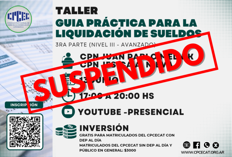 Estimados Colegas Informamos a uds que se SUSPENDE el taller programado para hoy sobre «Guía práctica para la liquidación de sueldos – 3ra parte (nivel III – avanzado)», a cargo de los Cres. Juan Pablo Melnik y Jesica A. NievaEl taller se dictará el día ...