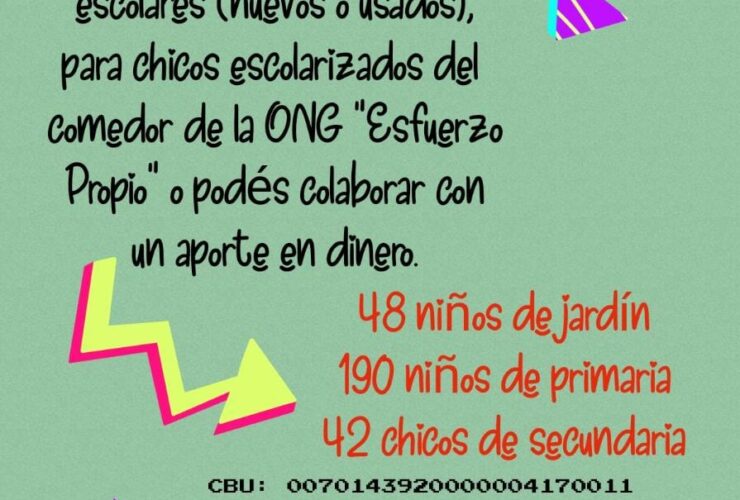 Estimados Colegas Invitamos a uds a sumarse a la colecta solidaria en beneficio de los chicos del comedor de la ONG «Esfuerzo Propio».El mismo cuenta con 280 chicos escolarizados, desde jardín hasta secundaria.Esta colecta está organizada por la Comisión de Administración de nuestro Consejo.Tu aporte ...