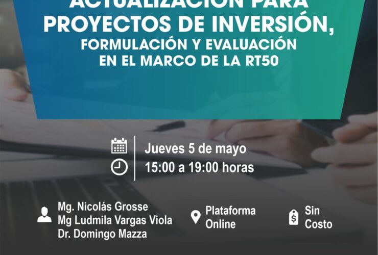 Estimados Colegas Enviamos a uds. invitación recibida por el CPCE de Jujuy para participar del curso virtual y gratuito sobre «Actualización para proyectos de inversión, formulación y evaluación en el marco de la RT50»Se llevará a cabo el jueves 05/05 de 15 a 19 hs, ...