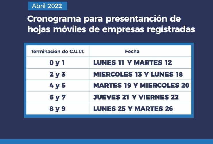 Estimados Colegas Enviamos a uds cronograma del calendario para la presentación de las hojas móviles computarizadas y/o libros sueldos digitales correspondientes al mes de Marzo/22, a presentarse en Abril/22, en el horario de 14:15 a 18:45 hs, sin excepción.Por cualquier consulta dirigirse al Whatsapp de la DIL 3834528938 o por ...