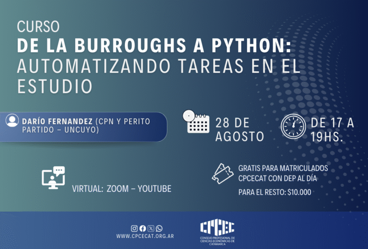 Estimados Colegas Invitamos a ustedes a participar del curso online sobre «De la Burroughs a Python: automatizando tareas en el estudio», a cargo del CPN Darío Fernández (Mendoza). 📅 Día: Jueves 28 de agosto🕢 Horario: 17 a 19 hs🖥️ Virtual – Zoom y Youtube ▶️ ...