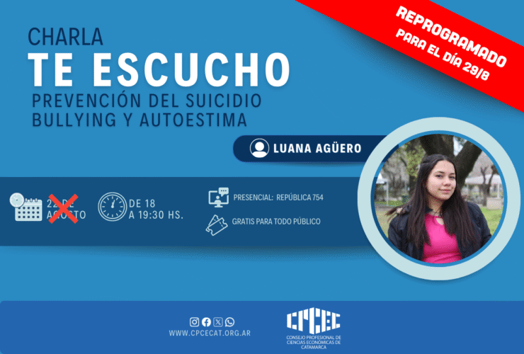 Estimados colegas: Debido a las jornadas institucionales que tienen los Colegios que debían asistir a la Charla sobre «Prevención del Suicidio, Bullying y Autoestima» en nuestro Consejo, se informa que la misma se REPROGRAMÓ para el día Viernes 29/08 de 18 a 19.30 ▶️ Inscripciones: ...