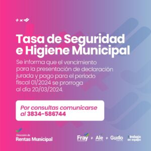 Información Prórroga – Tasa Municipal Seguridad e Higiene – Municipalidad de Fray Mamerto Esquiu Leer más » 23/02/2024 No hay comentarios